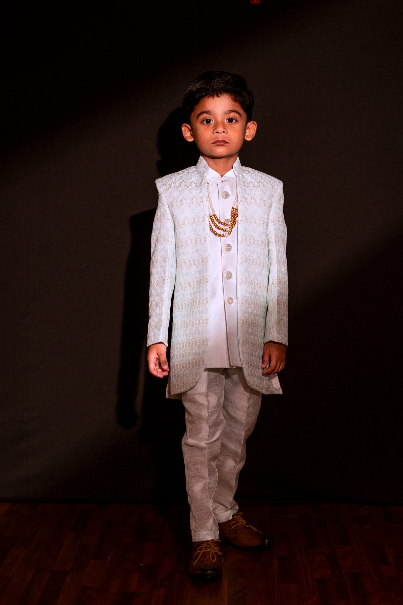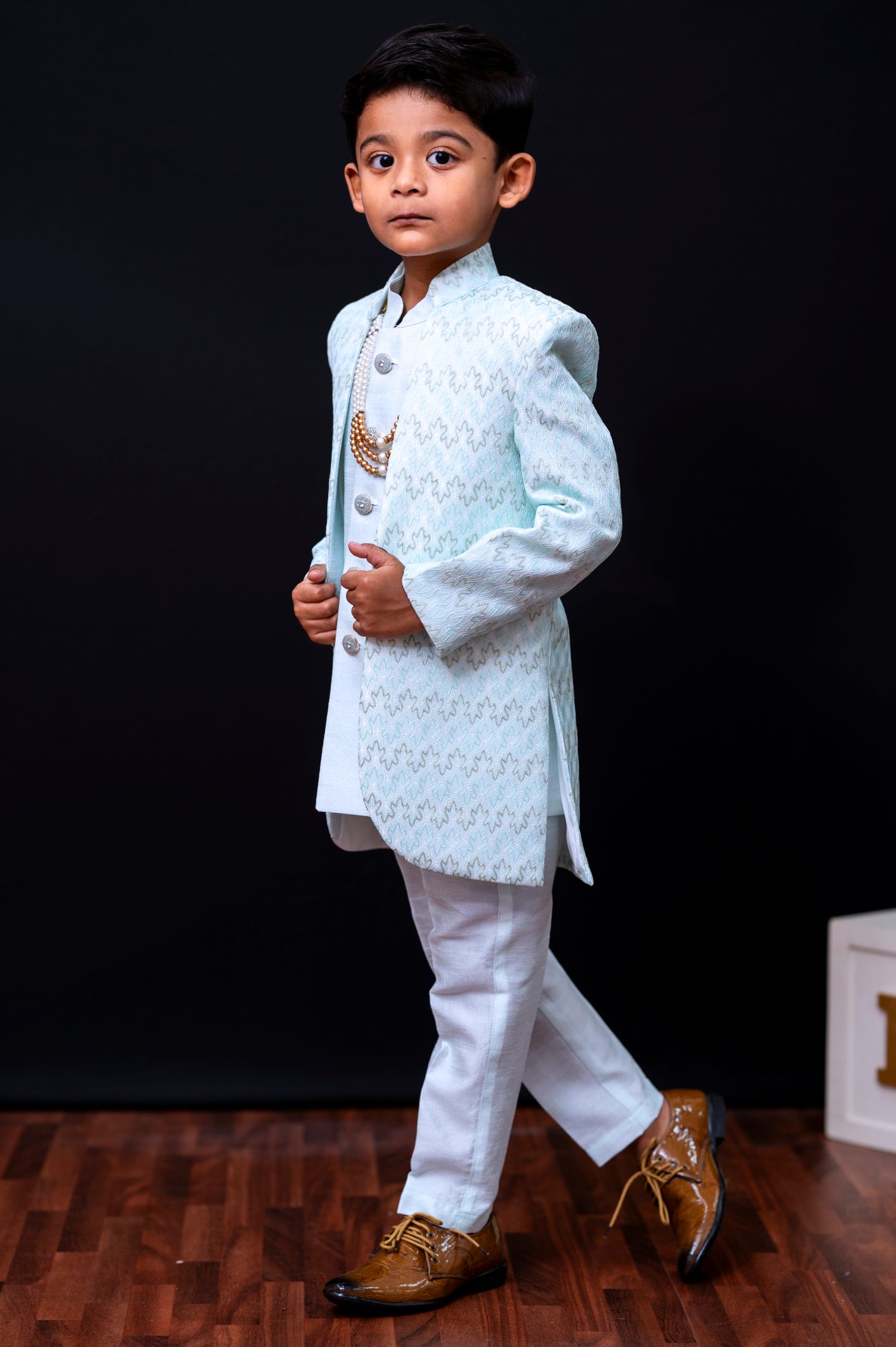 A sophisticated mint green sherwani designed with fine woven detailing and paired with pearl-inspired buttons. The rich kurta inner and matching pants give a regal look, making it ideal for weddings, festivals, engagements, and cultural events.