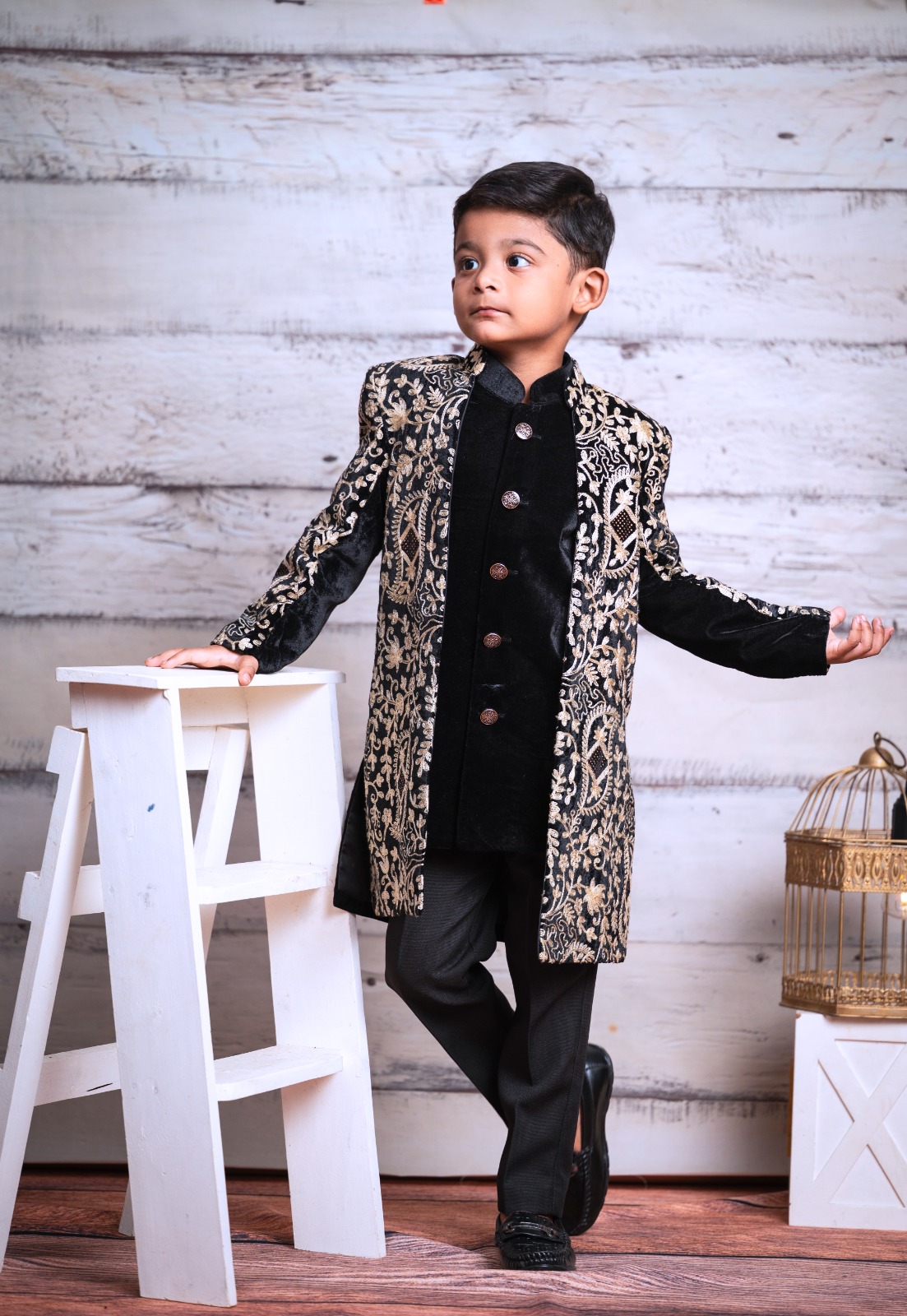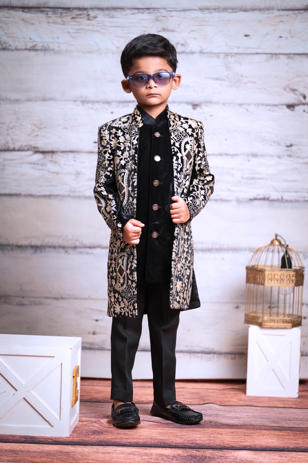 Sherwani Top: Premium Velvet with Heavy Embroidery (Gold Threadwork)